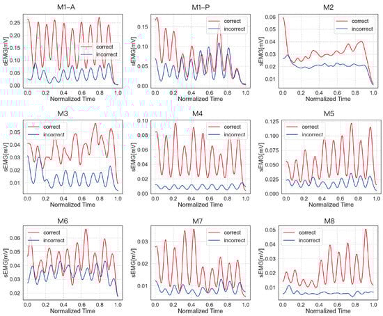 Figure 11 shows the waveform plots of each action under both correct and incorrect execution conditions. The x-axis represents the normalized time, while the y-axis indicates the sEMG signal amplitude. During M1, dorsiflexion and plantarflexion engage different muscle groups. Therefore, separate sEMG measurements were conducted. M1-A corresponds to the measurement of the anterior tibialis, while M1-P corresponds to the measurement of the peroneal muscles. Notably, different incorrect execution types were used for each measurement: the anterior tibialis was assessed under incorrect 1 of M1, whereas the peroneal muscles were assessed under incorrect 2. The correct execution form was identical for both measurements.