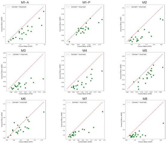 To explore the inter-individual variation in muscle activation between correct and incorrect executions, scatterplots were constructed for each of the eight chair-based exercises. In each plot, every data point represents one participant, where the x-axis indicates the mean sEMG value of the correct executions and the y-axis indicates the mean sEMG value of the incorrect executions.