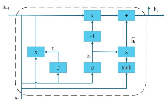 Previous studies have predominantly employed traditional deep learning approaches such as Transformers for bearing fault detection []. However, these methods inherently suffer from temporal correlation information loss due to their reliance on manual feature engineering and sequence format conversion. Recurrent neural networks (RNNs), particularly their advanced variants Long Short-Term Memory (LSTM) and gated recurrent units (GRUs), have gained attention for their native temporal modeling capabilities through chain-structured architectures. Among these, GRU demonstrate superior performance by integrating an update gate mechanism that maintains long-term dependency modeling capability while significantly reducing computational complexity []. The internal architecture of the GRU neural network is illustrated in Figure 1.
