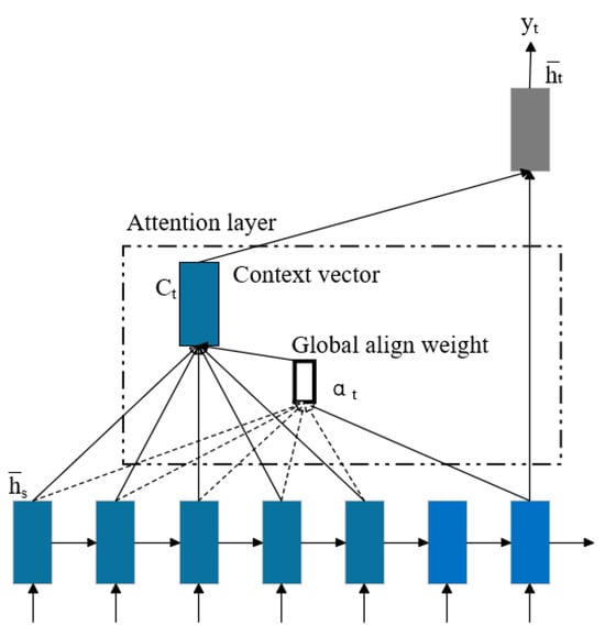 In temporal modeling tasks, the attention mechanism significantly enhances the model’s ability to capture critical features by simulating the selective attention mechanism in human cognition [,]. The global attention model computes the context vector by incorporating all hidden states of the encoder during derivation. The architecture of the global attention mechanism is illustrated in Figure 2.