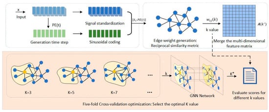 In response to the demand for the model structure mining ability caused by the spatio-temporal coupling characteristics of vibration signals in bearing fault diagnosis, this paper improves the graph structure modeling method based on the K-nearest neighbor algorithm, breaks through the bottlenecks of traditional KNN, such as the fault of similarity measurement in high-dimensional heterogeneous feature Spaces, insufficient adaptability to dynamic working conditions, and excessive cost of global parameter optimization, and innovatively proposes a multi-dimensional feature enhancement strategy: (1) construct a spatio-temporal fusion feature coding system; (2) design an adaptive generation algorithm for weighted graph structures; (3) establish a K-fold cross-validation hyperparameter optimization method based on graph neural networks. The specific model diagram is shown in Figure 3.