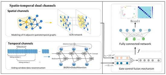 (3) The network architecture employs a dual-stream parallel framework that synchronously extracts spatial topological features and temporal sequence characteristics through graph convolutional networks (GCNs) and bidirectional gated recurrent units (BiGRUs), respectively. To achieve effective multi-scale representation fusion, this work innovatively introduces a gated fusion mechanism that adaptively integrates heterogeneous features via a dynamic weight adjustment strategy.
