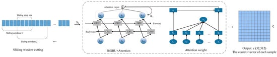 The BiGRU architecture enhances the contextual feature extraction capabilities by integrating forward and backward hidden states. Furthermore, this paper proposes embedding a global attention mechanism after the BiGRU framework to generate a context vector . Through dynamic weight learning, this mechanism enables cross-temporal feature interactions, thereby improving the representation capability of critical fault features and achieving superior global context integration.