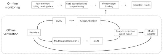 (3) Multi-Scale Heterogeneous Feature Fusion Module Based on Channel-Wise Attention Mechanism. In the feature fusion stage, this study proposes a cross-modal feature interaction framework based on a gated mechanism. Considering that different types of faults have varying sensitivities to spatial topological features and temporal dynamic features, this framework introduces a parameter-efficient gated unit to construct a nonlinear feature recombination mechanism to generate multimodal feature representations, which are then inputted into the classifier for fault category identification. On this basis, the system outputs a classification confidence vector and implements a dual-determination mechanism through the preset confidence threshold: when the confidence is higher than the threshold, it is determined as a known fault category; when it is lower than the threshold, the unknown fault identification function is activated. The standard process of online monitoring and offline training verification is shown in Figure 6.