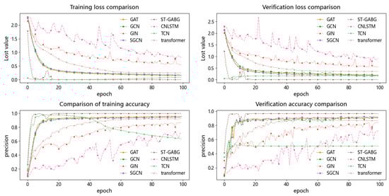 (1) Compared with traditional graph neural network models, ST-GABG demonstrates substantially superior performance. Specifically, while GAT and GCN achieve accuracy rates of 92.08% and 91.25%, respectively, ST-GABG attains a remarkable accuracy of 97.08%. This improvement stems from two critical innovations: first, by introducing a global attention mechanism that dynamically weights critical temporal steps after bidirectional GRU-based temporal feature extraction, ST-GABG effectively enhances spatiotemporal feature co-optimization. This approach not only reduces the training time by 9% but also improves the accuracy by 5% compared to the GAT model, which suffers from high computational complexity due to its reliance on single spatial attention mechanisms. Second, unlike GCN’s fixed neighborhood aggregation strategy, ST-GABG incorporates an improved KNN temporal-step joint encoding algorithm combined with a self-loop elimination weighted graph construction method. Through cross-validated graph parameter optimization, this approach achieves a 5.83% accuracy improvement. As shown in Figure 7, the proposed method can reach the verification loss convergence level more quickly and achieve a more stable loss curve. Combined with the early stopping strategy, it effectively reduces the training time. These results validate that the integration of bidirectional GRU temporal feature extraction with global attention dynamic weighting, synergistically combined with the improved K-NN algorithm, enables the effective fusion of temporal local–global features and complementary integration of spatiotemporal heterogeneous information.
