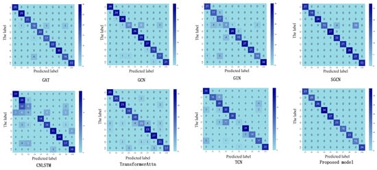 (2) This study compares ST-GABG with three representative models: TCN, Transformer integrated with attention mechanisms, and CNN-LSTM fusion architectures. Specifically, TCN employs dilated convolutions to expand the receptive field for comprehensive global information capture, but suffers from substantial parameter overhead that increases the computational costs. In contrast, ST-GABG adopts a more lightweight global attention mechanism that significantly improves model efficiency. Compared to Transformer architectures that rely on self-attention for long-range dependency modeling but encounter computational complexity-induced inference latency, ST-GABG implements a cascaded design combining gated recurrent units with global attention. This approach effectively reduces the computational complexity while enhancing dynamic temporal feature capture through BiGRU’s memory update mechanism, achieving a 10.17% accuracy improvement. Furthermore, unlike CNN-LSTM’s stacked paradigm that sequentially extracts local features followed by sequence dependencies in separate phases, ST-GABG dynamically weights BiGRU hidden states via attention mechanisms to enable the deep fusion of local detailed features and global semantic information. Figure 8 visually demonstrates these performance advantages through 3D confusion matrix visualization.