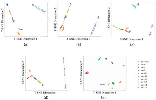 To validate the deep feature extraction capability of the proposed model under rolling bearing signal-driven few-shot diagnosis scenarios, this study employs the t-distributed stochastic neighbor embedding (T-SNE) algorithm for nonlinear dimensionality reduction and visual analysis of high-dimensional feature spaces [,]. Class probability serves as one of the primary perspectives for evaluating model outcomes and identifying problematic samples []. As illustrated in Figure 10, conventional methods exhibit significant limitations with severe inter-class overlap and blurred decision boundaries in the projected space. The proposed model (subfigure e) demonstrates superior feature separability: specifically, intra-class compactness is significantly enhanced, inter-class discriminability is strengthened, and fault categories form independent clusters with explicit geometric margins; decision boundaries achieve higher clarity. This visualization validates the proposed model’s advantages in rolling bearing signal representation clustering from a geometric-topological perspective. Figure 11 demonstrates that ST-GABG exhibits excellent clustering representation capability and dataset-adaptability generalization performance across three bearing datasets from CWRU, Southeast University, and Jiangnan University.