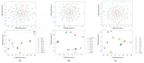 T-SNE scatter plots of the ST-GABG model under the bearing dataset of Southeast University (a), Case Western Reserve University bearing dataset (b), and Jiangnan University dataset (c), respectively.