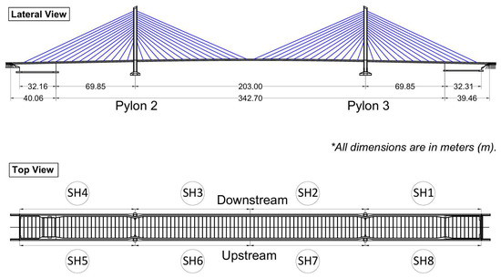 The case study is the cable-stayed Rio Papaloapan Bridge, located in Veracruz, Mexico. It was constructed in 1994, and it features a main span of 203 m and a total length of 407 m. As illustrated in Figure 1, the structure comprises 112 cables distributed among 8 semi-harps, with each semi-harp consisting of 14 cables. Notably, the cables in the first and fourteenth positions are the shortest and largest, respectively.