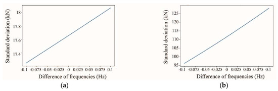 Analyzing Equation (9), it is observed that the first term () provides an error value close to the squared standard deviation of the direct tension. The reason for this is that the first measurement of vibration frequencies is divided by the second one, resulting in a value similar to 1, which means that the resulting error is almost equal to the squared standard deviation of the direct tension. In the case of the second () and third terms (), if the values of vibration frequency and their standard deviation are the same, the resulting errors are equal. The last two terms could provide an error value equal to several times the squared standard deviation of the vibration frequencies. The reason for this is that the direct tension value is involved as the numerator of the division against the vibration frequencies. Additionally, it can be established that the higher the value of the constant, , the higher the error in the terms related to the last frequency measurement, . Figure 2a and Figure 2b depict a simulation of error propagation for cables on the 1st and 14th positions of semi-harp number 2, respectively. The simulation compares the standard deviation error in kN with respect to the difference in vibration frequencies between and ( is a fixed value and varies around it). The figure shows that cables in the 1st position exhibit higher error tolerance than the longer cables on the bridge. The horizontal axis represents the variation in the last frequency estimation, , showing increased propagation error as it deviates. For instance, in the cable at the 1st position (Figure 2a), the lowest standard deviation is 17 kN, with a −0.1 decrement in the last frequency measurement, , and the highest standard deviation is 18 kN, with a 0.1 increment in it. In the case of the cable at the 14th position (Figure 2b), the lowest standard deviation is approximately 98 kN, while the highest is 127 kN. For an easier interpretation, the examples were calculated based on historical data, assuming that all the data was collected with an accuracy of ±9.8 kN and ±0.02 Hz for direct tension force and frequency detection, respectively.