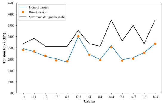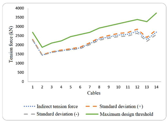 After analyzing the propagation error of the indirect tension force, it is necessary to ascertain whether this method is sufficiently accurate for monitoring this parameter in cables supporting a bridge. In this context, the indirect tension and the standard deviation needs to be compared with the maximum tension of the threshold design for the cables. This value represents the service limit state, imposing restrictions on stress when the structure operates under normal performance conditions [32]. In this case, it was calculated based on 45% of the load applied to the cable, ensuring the steel reaches its ultimate stress. Maintaining the tension force of the cables within the design limits is crucial for the regular performance of the cable-stayed bridge.