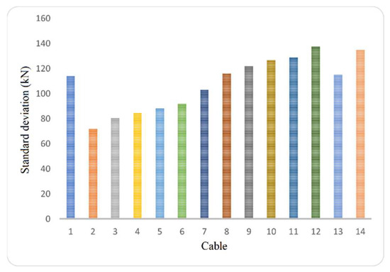 where is the percent difference, is measured value, and is referenced value. Figure 3 illustrates the tension force values for all the cables in semi-harp number 5, with a standard deviation that covers ±5% of the total tension force. Meanwhile, Figure 4 depicts the relationship between the percentage of total tension (5%) and the standard deviation.