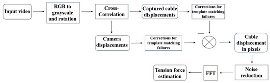 The proposed methodology to determine the vibration frequencies of the cables is outlined in Figure 7. First, a calibration step is required to calculate the intrinsic and extrinsic parameters of the camera, compensating for image deformations caused by the camera sensor and its optical elements. Calibration was carried out by taking several pictures of a chess table from different positions. Subsequently, the second step of the algorithm involves converting the image from RGB (red, blue, green) to grayscale and rotating it to its normal position relative to the camera sensor axis, aiming for a horizontal or vertical position of the cable. The Affine Transformation method [36] was employed to rotate the images, considering the design inclination angles of each cable. The third step is to establish two points of interest as templates to determine displacements using cross-correlation. In this case, the methodology implemented was the Normalized cross-correlation, represented as follows [37]: