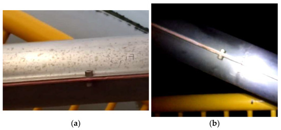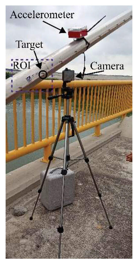 Nevertheless, with the recent increase in resolution in digital cameras and their affordability, this instrument provides an opportunity to measure vibration remotely without the need for physical contact by integrating it with computer vision techniques. Recently, computer vision has been employed more frequently in structural health monitoring to analyze the behavior of structures from a fixed position [5,6,7] or from multiple perspectives by mounting a camera on Unmanned Aerial Vehicles (UAVs) [8,9]. In the case of cable monitoring using a fixed camera, ref. [10] estimates cable tension force through a computer vision approach during the roof erection stages. The differences between the proposed methodology and a load cell reading were within 5.6%. Displacement measurement from multiple targets has also been demonstrated using a vision-based system [11], validated in cable-stayed footbridge trials for deck deformation and cable vibration by comparing results with data obtained using accelerometers as a reference. In [12], a processing approach is proposed for obtaining the full-field modal parameters of cable vibration. This was achieved using an unsupervised machine learning algorithm and video recordings from the cables. The performance of two different digital image techniques (digital image processing and digital image correlation) has been compared for cable tension monitoring against acceleration [13]. Additionally, ref. [14] presents a methodology for monitoring cable tension force using a moving handheld camera. The camera displacement was determined by tracking specific points on the deck and pylon of a bridge. The maximum variation was ±6.69% of the mean tension due to the environmental conditions during the real-time estimation. Up to this point, the listed methodologies have been collecting data outside of the structure or under ideal conditions in the laboratory.