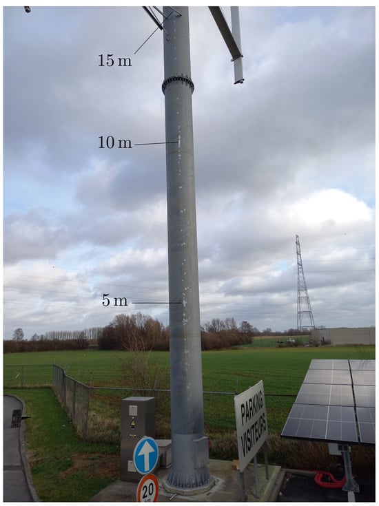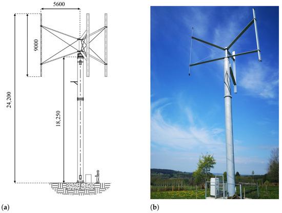 The studied vertical axis wind turbine is the model F100-10 of Fairwind (Fleurus, Belgium). It is a machine of in height, characterized by a power of 10 . A scheme of this VAWT can be found in Figure 1a, where the measurements are expressed in , and a picture of the machine in Figure 1b.