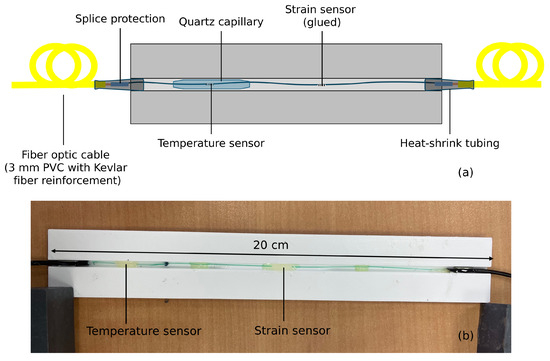 Package for the inside installation, with one strain and one temperature FBG: (a) scheme, (b) picture.