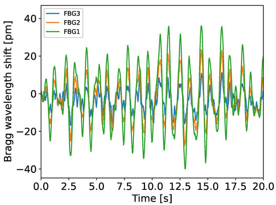 An evolution of the Bragg wavelength shift of the three strain sensors, placed at 5, 10, and 15 m, when the VAWT rotated at around 33 rpm (rotations per minute), can be found in Figure 4, for a duration of 20 s. The temperature during this measurement was around 15 °C.