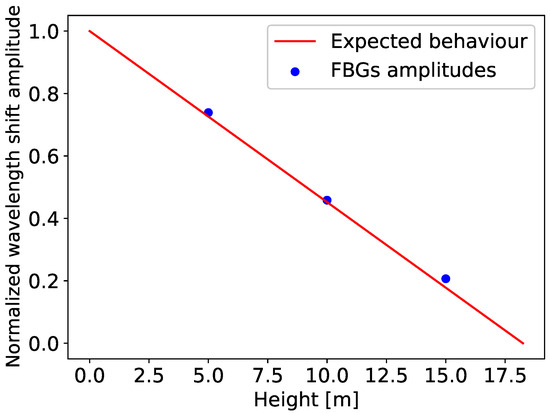 Comparison between the expected behavior (red) and the normalized Bragg wavelength shift amplitude (blue) for the three FBGs (placed at 5, 10, and 15 ), as a function of the height along the tower.