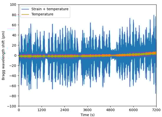 The signal recorded by both FBGs of one package can be found in Figure 6, for a duration of two hours (7200 s).