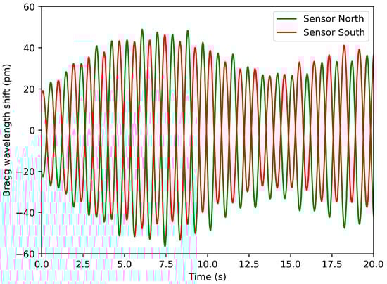 The useful information (strain) is inferred by subtracting the orange signal from the blue signal. Figure 7 represents the strain evolution for a duration of 20 s, for two opposite sensors (north and south).