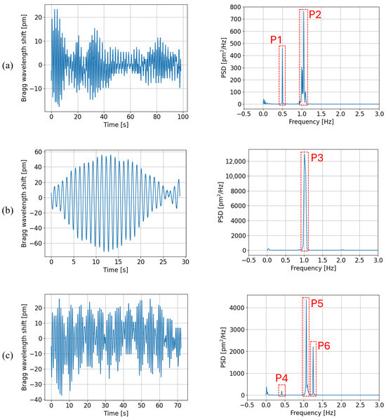 (Left) Bragg wavelength shift induced by strain vs. time at rotational speeds of (a) 10 rpm, (b) 20 rpm, (c) 25 rpm. (Right) Corresponding power spectral density computations.