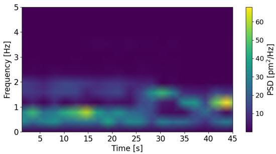 The limitation of power spectral density is the assumption that the signal is periodic and infinitely long. In practice, the frequencies of the tower oscillations change with time. Therefore, computing the spectrogram of the signal is a good alternative to show the evolution of the frequencies as a function of time. Figure 9 shows the spectrogram of the measured signal when the rotational rate of the VAWT generator was imposed from 35 down to 27 rpm by steps of 1 rpm every 5 .