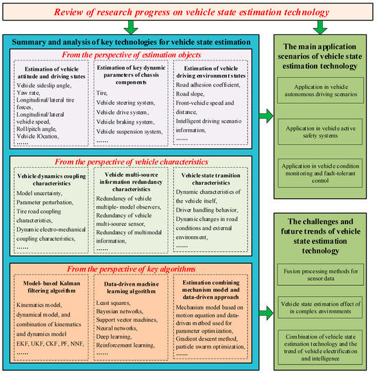 This paper focuses on the research progress of vehicle driving state estimation methods, and the main contents of this paper are shown in Figure 1. We review the state of the art for the latest vehicle state estimation technology and ideas from different perspectives. The rest of this paper is organized as follows. In Section 2, the research progress of vehicle state estimation from the perspective of estimation objects is analyzed. In Section 3, the research progress of vehicle state estimation from the perspective of vehicle characteristics is discussed. In Section 4, the research progress of vehicle state estimation from the perspective of key algorithms is summarized. In Section 5, the main application scenarios of vehicle state estimation technology are analyzed. In Section 6, the challenges and future trends of vehicle state estimation technology are discussed. Finally, conclusions are drawn in Section 7.