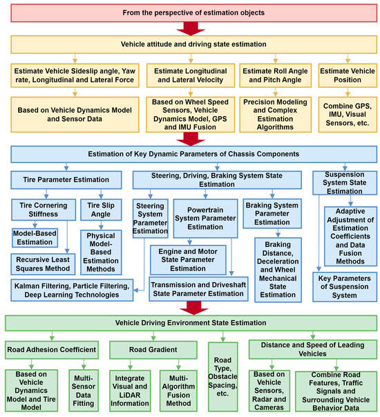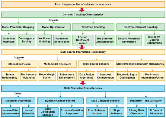 The effectiveness of vehicle state estimation is influenced by three core factors: dynamic coupling characteristics, multi-source information redundancy, and state transition characteristics. The dynamic coupling characteristics are reflected in the mutual influence between model parameters, which may lead to model mismatch and algorithm instability. Research on decoupling parameter relationships using fine-grained modeling and multi-model interaction strategies combined with high-precision recognition methods has been performed to improve estimation accuracy. The tire–road coupling characteristics need to be analyzed in conjunction with the reinforcement mechanism of the LuGre tire model, while the electromechanical coupling brought about by electrification needs to be modeled specifically. Multi-source information redundancy is achieved by integrating multiple model observers, multiple sensors, and modal data of electromechanical systems, utilizing complementary redundant information to enhance robustness. In addition, the state transition characteristics focus on the adaptive ability under dynamic operating conditions. The algorithm is required to have dynamic weight adjustment and anti-interference design for sudden changes in road conditions, time-varying parameters, and system interference. The data-driven approach and multi-source information fusion can suppress estimation bias caused by state transitions and support stable output in high-speed/extreme scenarios. The three jointly drive the evolution of vehicle state estimation toward high accuracy, robustness, and real-time performance, providing key support for intelligent driving. The overall research content architecture of this chapter is shown in Figure 3.