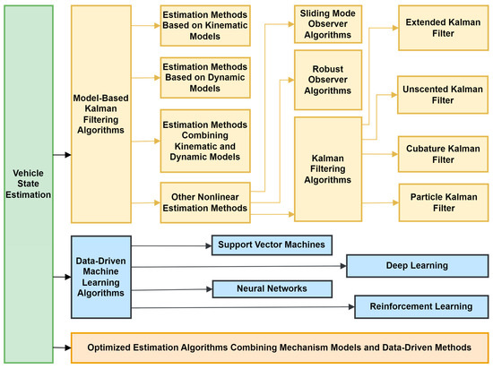 The key algorithms for vehicle state estimation are mainly divided into three categories: model-based Kalman filtering, data-driven machine learning algorithms, and fusion optimization methods combining the two. The model-based Kalman filtering algorithm focuses on vehicle kinematics and dynamics models and combines state observers with dynamic equations to achieve dynamic behavior description. The kinematic model is suitable for low-speed simple scenarios, relying on parameters such as speed and steering angle. The dynamic model analyzes the force relationship under complex working conditions using nonlinearity, tire characteristics, and other factors. The Kalman filter optimizes noisy data using a prediction update recursive framework, and its improved form utilizes linearization or probability sampling to handle nonlinear problems, improving the estimation accuracy of high-dimensional state spaces. Data-driven machine learning algorithms utilize deep learning, neural networks, support vector machines, and reinforcement learning to parse complex sensor data. However, data quality and annotation accuracy have a significant impact on model performance, and complex models require efficient training algorithm support. The fusion optimization algorithm combines the advantages of model and data-driven approaches, providing an interpretable framework based on physical meaning mechanism models. The data-driven method optimizes model parameters and compensates for mismatches in complex operating conditions. This type of fusion method improves robustness through parameter collaboration, weight adaptation, and other means and has become a current research hotspot. However, its performance depends on the balanced design of data preprocessing and algorithm selection strategies. The overall research content architecture of this chapter is shown in Figure 4.