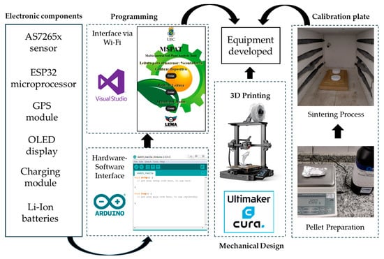 The parts made of PLA (polylactic acid) were 3D printed using UltiMaker Cura 3.6 software via an Ender-3 S1 printer (Creality, Shenzhen, China). The ESP32 microprocessor was programmed using the Arduino IDE 2.3.6 platform, and the Wi-Fi communication interface of the smartphone was developed using Visual Studio 2022 v17.14 software. These activities were carried out at the Laboratory of Electronics and Agricultural Mechanisation (LEMA) of the Federal University of Ceará (UFC). The flowchart presented in Figure 1 illustrates the stages in building the equipment components, encompassing programming, 3D printing, and the development of the reference plate used for sensor calibration.