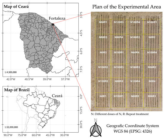 A field study involving the use of maize to calibrate the sensor was conducted in the experimental area of LEMA on the Pici Campus of the Federal University of Ceará in Fortaleza (Figure 2), located at latitude −3.745294 and longitude −38.581159 at an altitude of 19 m. According to the Köppen classification, the climate in the experimental area is of the Aw’ type. The soil in the area is classified as a red-yellow Argisol with a sandy clayey-loam texture. We study included the AG-1051 maize cultivar, recommended for silage and green maize production. To provide different field conditions for N in the leaf tissue, the maize crop, under drip irrigation, was subjected to different doses of nitrogen fertiliser (urea) in a completely randomised design (CRD). Six treatments, namely N0, N60, N90, N120, N150, and N180, corresponding to 0, 60, 90, 120, 150, and 180 kg·ha−1 N, respectively were applied with four replications, totaling 24 experimental units. Fertilisation was split according to the plan shown in Table 1. The other nutrients were apportioned such that the demands of the crop would be met and supplied based on the results of the soil analysis (Table 2) using the following fertilisers: potassium chloride, Single Super Phosphate, MAP (monoammonium phosphate), magnesium sulphate, and Microcomplex® (Biolchim do Brasil, São Paulo, Brazil).