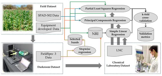 In a second approach, Partial Least Squares Regression (PLSR) and Principal Component Regression (PCR) were used to develop predictive models for the LNC using data from FieldSpec 3 spectroradiometer; the experimental device; and the SPAD-502. These algorithms were chosen for their ability to handle the high dimensionality and collinearity of spectral data. PLSR projects latent variables that optimise the covariance between predictors and the response variable, and PCR isolates principal components from the predictors for subsequent regression, reducing dimensionality and enhancing model interpretability. Due to the volume of spectral data per instrument, the best bands were selected via Stepwise regression using the ‘stepAIC’ function of the ‘MASS’ package in R [25], in which the Akaike Information Criterion (AIC) is applied as the selection criterion in a bidirectional stepwise procedure. After developing the models, k-fold cross-validation was carried out with k = 4. Following validation, the models were evaluated using the Mean Absolute Error (MAE), Root Mean Square Error (RMSE), and Coefficient of Determination (R2). These methodological enhancements improved both the accuracy and robustness of the predictive models. Figure 3 presents a flowchart depicting the analyses performed with the datasets acquired from the field, the darkroom, and the LNC determination.