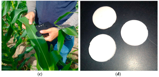 Assembly and operation of the MSPAT: (a) electronic wiring, (b) device in operation, (c) field evaluation using maize, and (d) calibration plate made of sintered barium sulphate.
