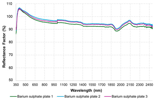 - Poh, A.H.; Jamaludin, M.F.; Fadzallah, I.A.; Nik Ibrahim, N.M.J.; Yusof, F.; Adikan, F.; Moghavvemi, M. Diffuse reflectance spectroscopic analysis of barium sulphate as a reflection standard within 173–2500 nm: From pure to sintered form. J. Near Infrared Spectrosc. 2019, 27, 393–401. [Google Scholar] [CrossRef]