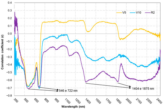 Yoder and Pettigrew-Crosby [32] also identified a strong correlation between the 550 and 730 nm bands and LNCs. These results show that the green and red-edge regions have great potential for use in measuring LNC due to the influence of the cellular structure of the leaves and the chlorophyll concentration [33]. Furthermore, when analysing the r value during each phenological stage (Figure 8), an increase can be seen in the influence of the infrared wavelength, especially in the water absorption bands (1404 and 1875 nm), corroborating the findings of Chi et al. [34], which show that water content is a limiting factor for the LNC during the reproductive stage.