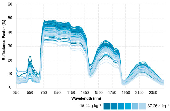 Figure 9 illustrates the spectral behaviour of leaves as a function of nitrogen concentration. The blue-tone scale used to represent reflectance values shows that leaves with lower nitrogen concentrations exhibit higher reflectance, identified by darker blue shades. Conversely, leaves with higher nitrogen concentrations display lower reflectance values, highlighted by lighter blue tones. These results confirm the inverse relationship between foliar nitrogen content and spectral reflectance, demonstrating the influence of a leaf’s chemical composition on its spectral response.