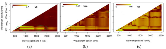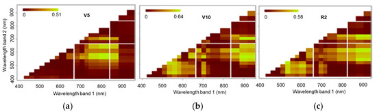 Coefficient of determination (R2) of normalised ratio indices (NRIs) calculated using MSPAT data at phenological stages V5 (a), V10 (b), and R2 (c).