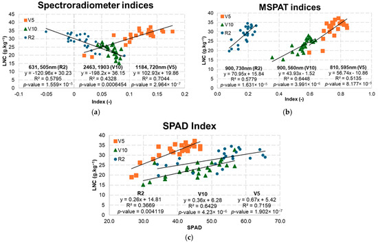 The best NRIs obtained with the spectroradiometer (Figure 12a) were acquired using the NIR (1184 nm) as a normalised ratio with the red-edge band (720 nm) at stage V5, resulting in an R2 of 0.7044. The other indices with the highest values for R2 were obtained using the visible bands (631 and 505 nm) at stage R2 and bands between the SWIR (2463 and 1903 nm) at stage V10. In relation to the MSPAT (Figure 12b), using the NIR bands as a normalised ratio with the red-edge (730 nm) or green (560 and 595 nm) bands gave a better fit for the model at stage V10, with an R2 of 0.6448. The results obtained by using the SPAD index (Figure 12c) to estimate the LNC at phenological stage V5 were significant (R2 = 0.7159). However, as the crop developed, R2 values declined to 0.71, 0.50, and 0.36 (Figure 12), accompanied by a reduction in the angular coefficients of the models (0.67, 0.37, and 0.28).