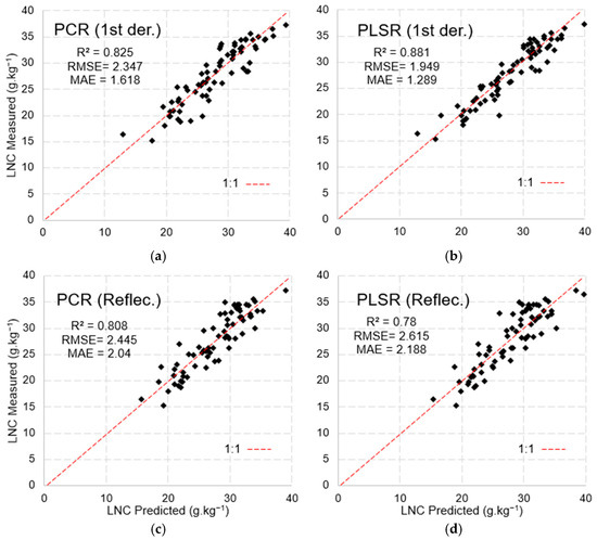 The validation results for the predictive models using PLSR and PCR (Table 4) are similar to those found by Zhang et al. [38], who evaluated different levels of N in the leaves of cotton plants and found an R2 of between 0.80 and 0.84 using first-derivative PCR data, while the PLSR models gave an R2 of 0.79 to 0.81. Their study also evaluated the performance of the models using raw reflectance data and found that, unlike in the present study, there was no difference between the two approaches. PLSR is a well-established method in spectroradiometry and chemometrics for developing predictive models, as it effectively reduces multicollinearity and maximizes the covariance between predictor and response variables. As such, it differs from PCR, as it reduces the dimensionality of data by extracting the principal components without considering their relationship with the dependent variable, whereas PLSR simultaneously models independent variables and the dependent variable, ensuring that the extracted components are relevant to the prediction [39]. Meacham-Hensold et al. [40] examined models for predicting LNCs in tobacco leaves using PLSR and obtained an R2 of 0.81. The models in the present study showed similar performance, achieving an R2 of 0.78 using raw reflectance data measured with a spectroradiometer.