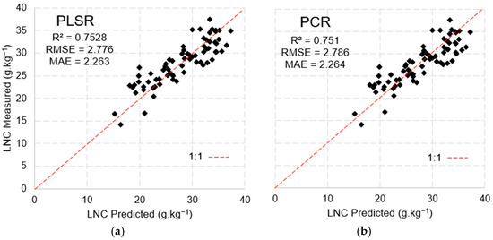The model developed using PLSR with the MSPAT data explained 70.8% of the variance with six factors, while PCR explained 68% of the variance, including nine factors. The results of the validation (Figure 14) show the remarkable ability of both methods in predicting the LNC; however, PLSR yielded the better performance (R2 = 0.712, RMSE = 2.99 and MAE = 2.43).
