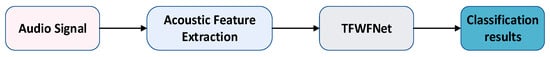 Figure 1 illustrates the schematic structure of the overall ASC system, which mainly consists of three components: acoustic feature extraction, the proposed TFWFNet model, and the final classification results. The acoustic feature extraction module is responsible for capturing distinguishing features of various sound scenes from audio signals. Typically, the signals are converted into spectrograms using the short-time Fourier transform, which are then used as input to the subsequent network model.