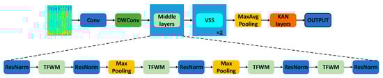 The TFWFNet designed in this study consists of three main components. The first component is the TFWM, which integrates spectrogram information across three dimensions: the time dimension, frequency dimension, and high- and low-frequency paths extracted via wavelet transform. It also incorporates the GTSAU, proposed in this paper, to fuse multidimensional features, thereby enhancing the performance and robustness of acoustic scene classification tasks. The second component is the VSS module, aimed at improving the model’s ability to capture contextual information and understand complex spatial relationships in acoustic scenes. The third component is a classifier composed of the KAN layers, designed to efficiently fit complex nonlinear relationships in the data and enhance generalization across heterogeneous sources. The overall architecture of the model is illustrated in Figure 2.