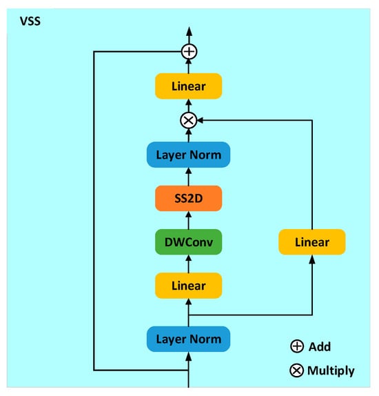 The VSS module forms four distinct sequences by using 2D Selective Scan (SS2D) to first expand the feature map along four directions [29]. Each feature sequence is then processed in parallel using a separate SSM block. Finally, these sequences are recombined into a complete, information-rich 2D feature map. The Selective Scanning Spatial State Sequence Model serves as the core SSM operator of the VSS block, enabling each element of a one-dimensional array to interact with all previously scanned elements through compressed hidden states. The overall structure of the VSS module is shown in Figure 5.