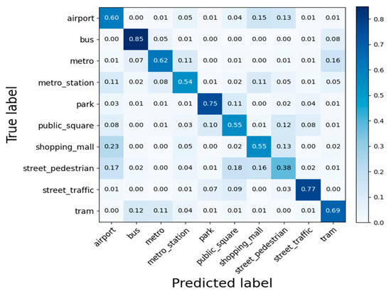 The confusion matrix of the test set on the 100% development subset is shown in Figure 6. From the results, the accuracy gap between bus and street pedestrian classes is large, mainly due to the similarity, diversity, and complexity of the sounds, which can easily cause confusion in scene categorization.