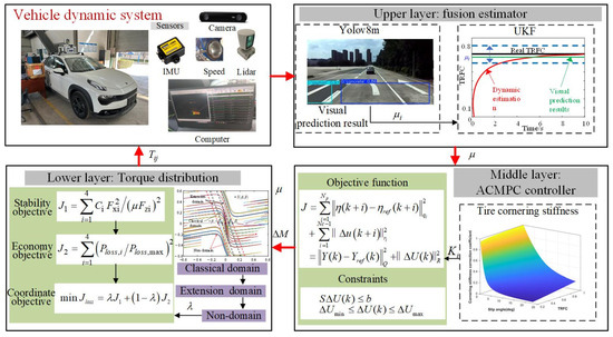 In the upper layer, the TRFC is estimated based on visual and dynamic information collected by onboard sensors. To accelerate the convergence of the estimator, the road type obtained from vision is used as the initial value for the UKF estimator. The middle layer updates the tire cornering stiffness based on the estimated TRFC and vehicle dynamic states. The direct yaw moment controller based on the adaptive MPC is then established to determine the direct yaw moment, which is subsequently passed to the lower layer. Comprehensively considering the vehicle stability and energy in the lower layer, the torque vectoring controller based on quadratic programming is developed to optimize the distribution of driving torques. The weight between handling stability and energy conservation is dynamically coordinated based on an extended phase-plane, in which the stability boundary is determined by the TRFC. The final optimized torque commands are then applied to the four in-wheel motors of the DDEVs.