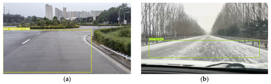 During the annotation process, we should align the bounding boxes as closely as possible with the road boundaries, ensuring that the road occupies most of the labeled area while minimizing the inclusion of non-road elements. After annotation, the dataset was randomly divided into a training set and a validation set, with the training set comprising 70% and the validation set 30%. The recognition results of the trained network model are shown in