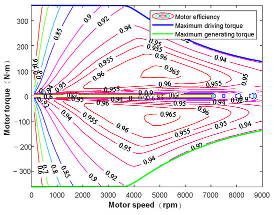 is the motor efficiency, which depends on torque and speed, and can be obtained from the efficiency map shown in