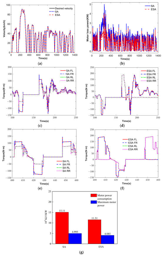 Figure 14g, compared to the stability-oriented torque distribution (SA) strategy, the torque vectoring controller based on ESA achieves a reduction of 18.22% in peak motor power loss and 23.83% in motor power consumption, which highlights the superior energy conservation of the proposed torque vectoring controller.