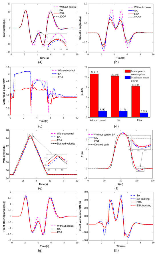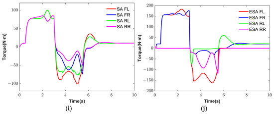 Figure 16g–j illustrates the responses of the front wheel steering angle, direct yaw moment, and driving torques. ESA strategy yields higher driving torques, improving the motor efficiency and energy conservation.