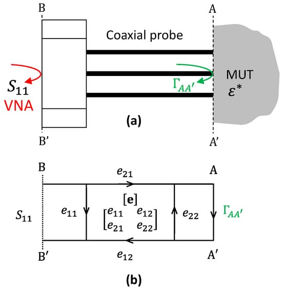 The open-ended coaxial probe. (a) A schematic of the measurement system, where the VNA measures the reflection coefficient S11, which is affected by the systematic errors introduced by the probe and its interface with the MUT. (b) A representation of the coaxial probe’s error-box model, illustrating the relationship between S11 and the reflection coefficient at the probe’s aperture, .